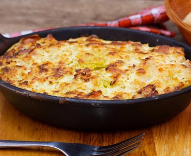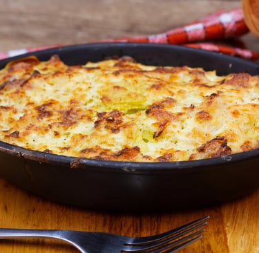 Ingredientes: 1kg de batata doce e 1 cenoura cozidas e amassadas, 1 cebola grande, 1 creme de leite, 500g de filé de frango cozido e desfiado, Molho de tomate, 1 xícara de espinafre picado, Tempero, azeite, 350g de queijo mussarela fatiada.