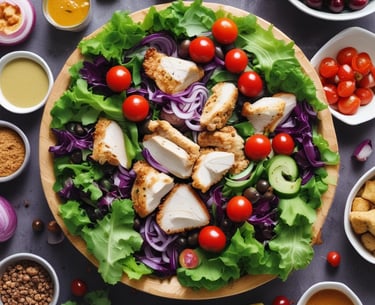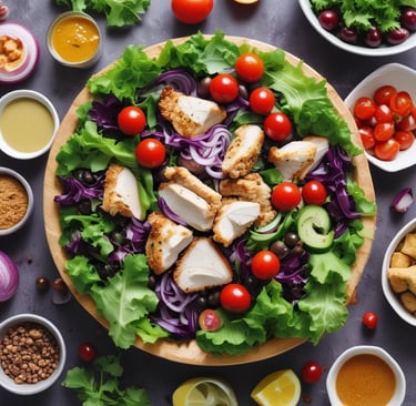 Ingredientes: 1 alface americana, 1 alface roxa, 1 cebola roxa, 10 tomates-cereja, 3 colheres de sopa de azeitona, 6 colheres de sopa de azeite, 6 colheres de sopa de mostarda, 3 colheres de sopa de mel, 1 colher de sopa de óleo, tempero de 3 dentes de alho e 1 colher de café de sal, 300 g de filé de frango cortado em cubos e temperado com 1/2 limão, 1 colher de sopa de vinagre, chimi-churry, açafrão e pimenta do reino.